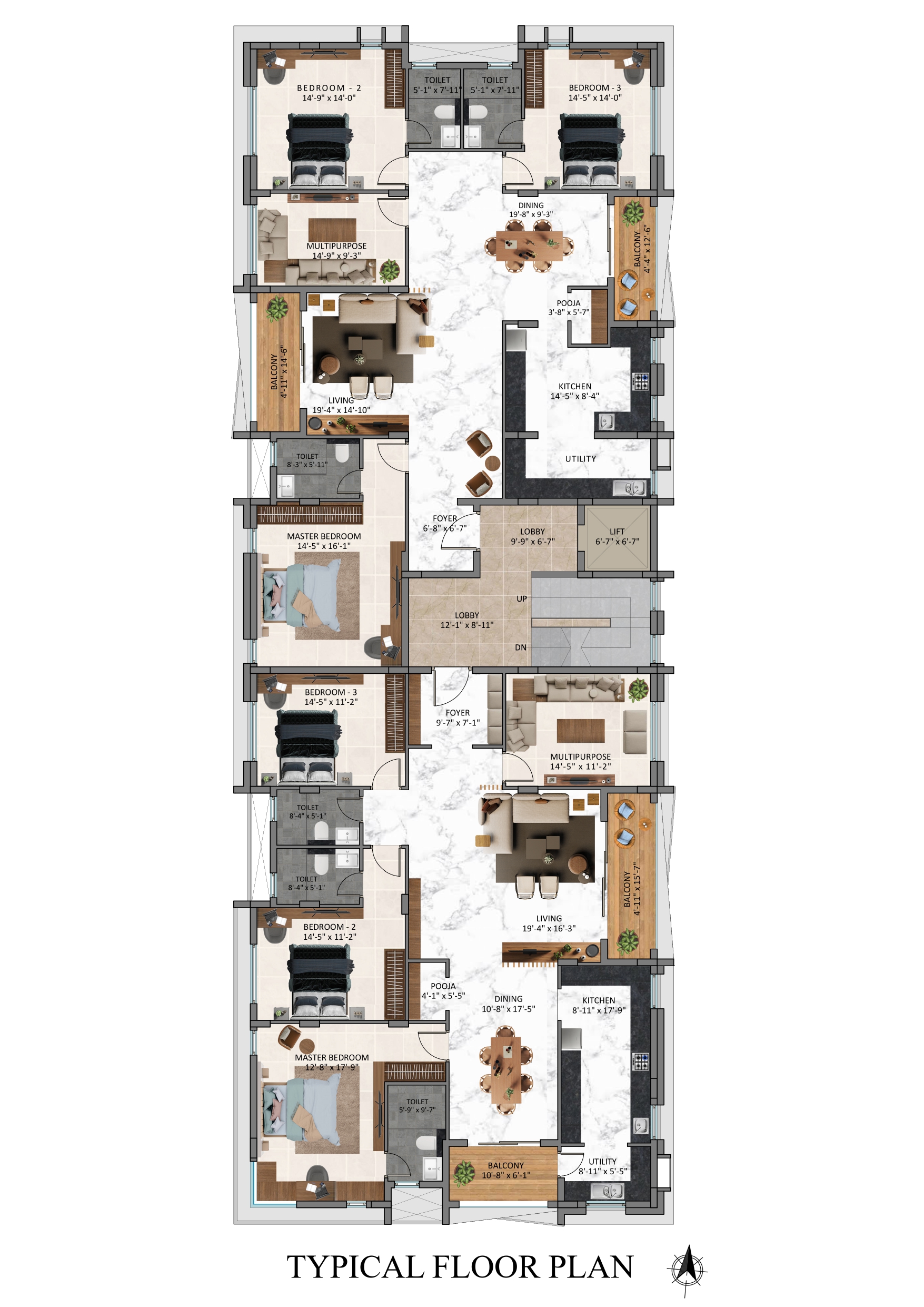 • Car Parking: Granolithic finishing over a bed pf PCC flooring Covered Car Parking for all flats
